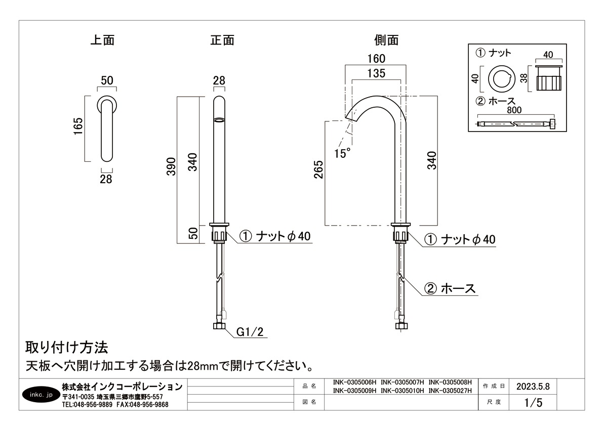本体1個 ナット1個 パッキン1枚 電源ユニット 皿ビス4×30 2本 フレキホース(G1/2) 1本