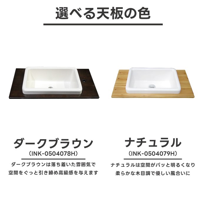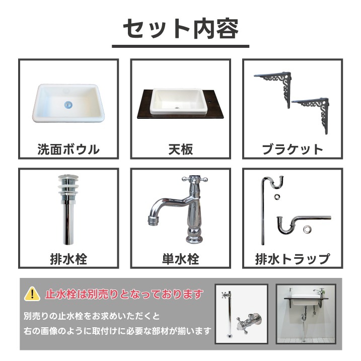 洗面ボウル(人工大理石) 天板(木) ブラケット(鉄) 排水栓(銅合金) 単水栓(銅合金) 排水トラップ(ステンレス) |
