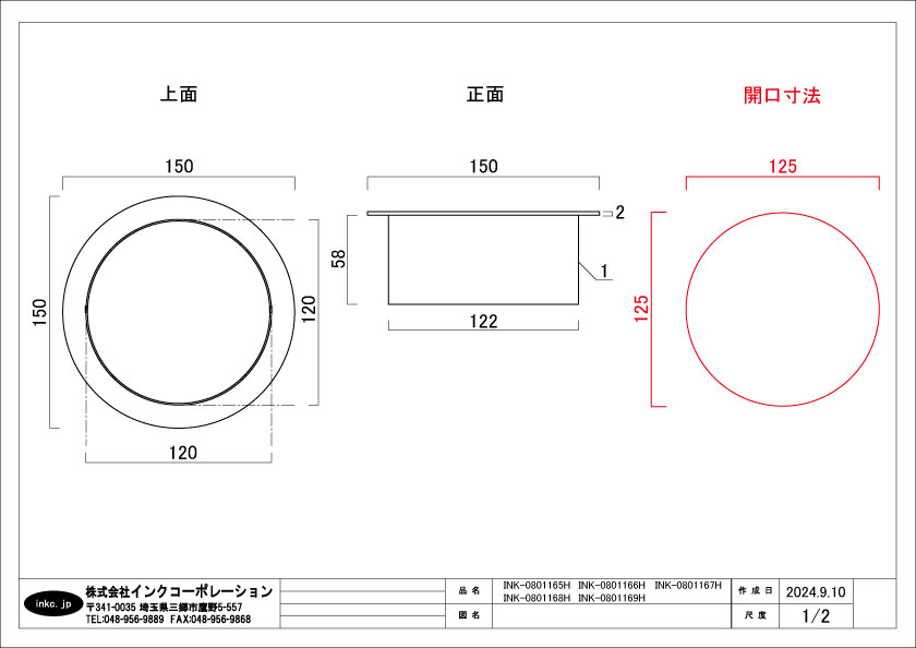 幅:150mm 奥行き:150mm 高さ:60mm(ふちの厚み:2mm 埋め込み部分:58mm)
