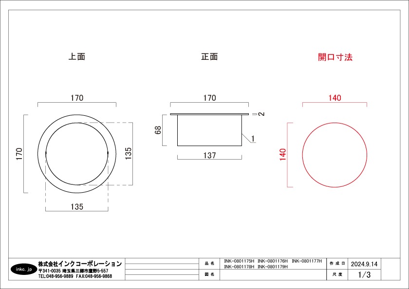 幅:170mm 奥行き:170mm 高さ:70mm(ふちの厚み:2mm 埋め込み部分:68mm)
