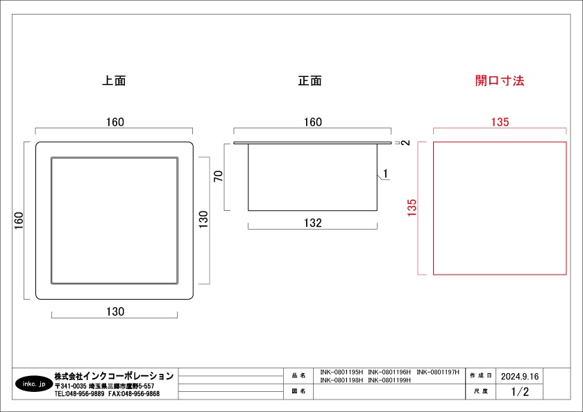 幅:160mm 奥行き:160mm 高さ:72mm(ふちの厚み:2mm 埋め込み部分:70mm)
