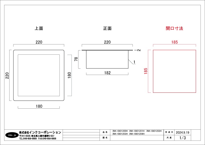幅:220mm 奥行き:220mm 高さ:80mm(ふちの厚み:2mm 埋め込み部分:78mm)