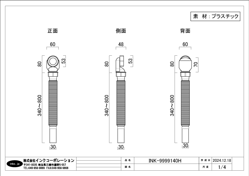 本体:FRP製 排水栓:銅合金 排水ホース:プラスチック