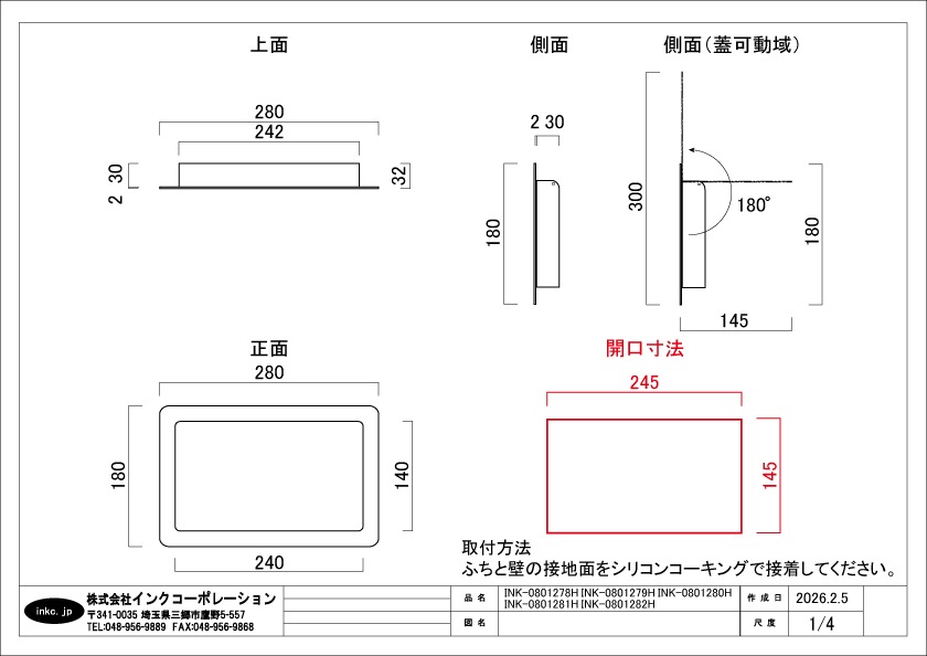 幅:280mm 奥行き:32mm 高さ:180mm(ふちの厚み:2mm 埋め込み部分:30mm)